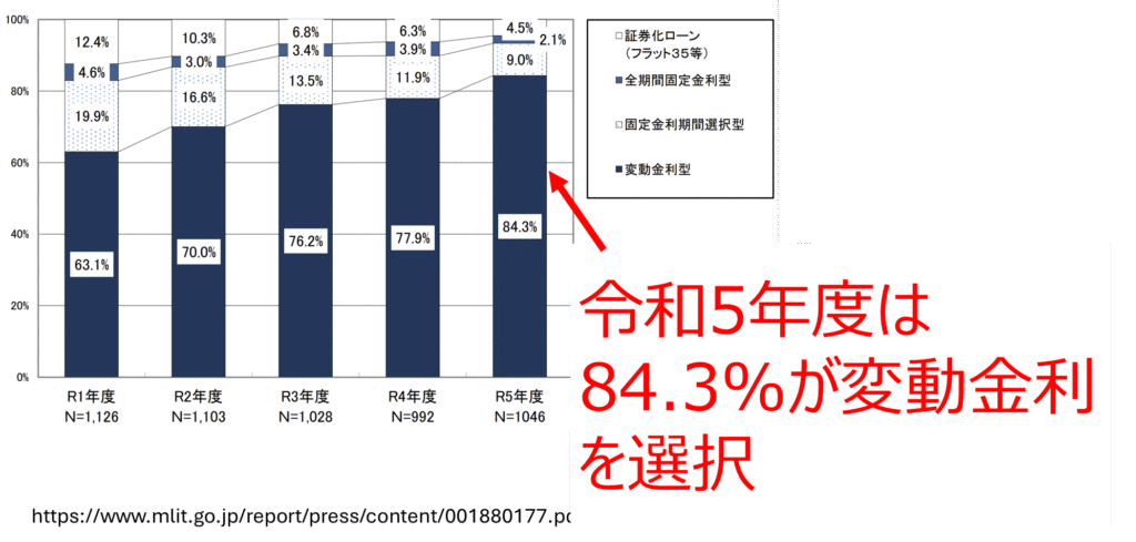 これまでは超低金利時代だったため、変動金利を選ぶ人が圧倒的に多く、令和5年度にはなんと84.3%の人が変動金利を選択しています!