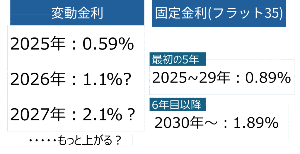 来年には住宅ローンの変動金利は0.9%程度まで上がる見通しがあり、さらに2027年以降には1.5%から2%を超える可能性も取り沙汰されています。つまり、変動金利は短期的にお得ですが、将来的に返済額が大きく膨らむリスクを抱えているという点が最大の注意点なんです。